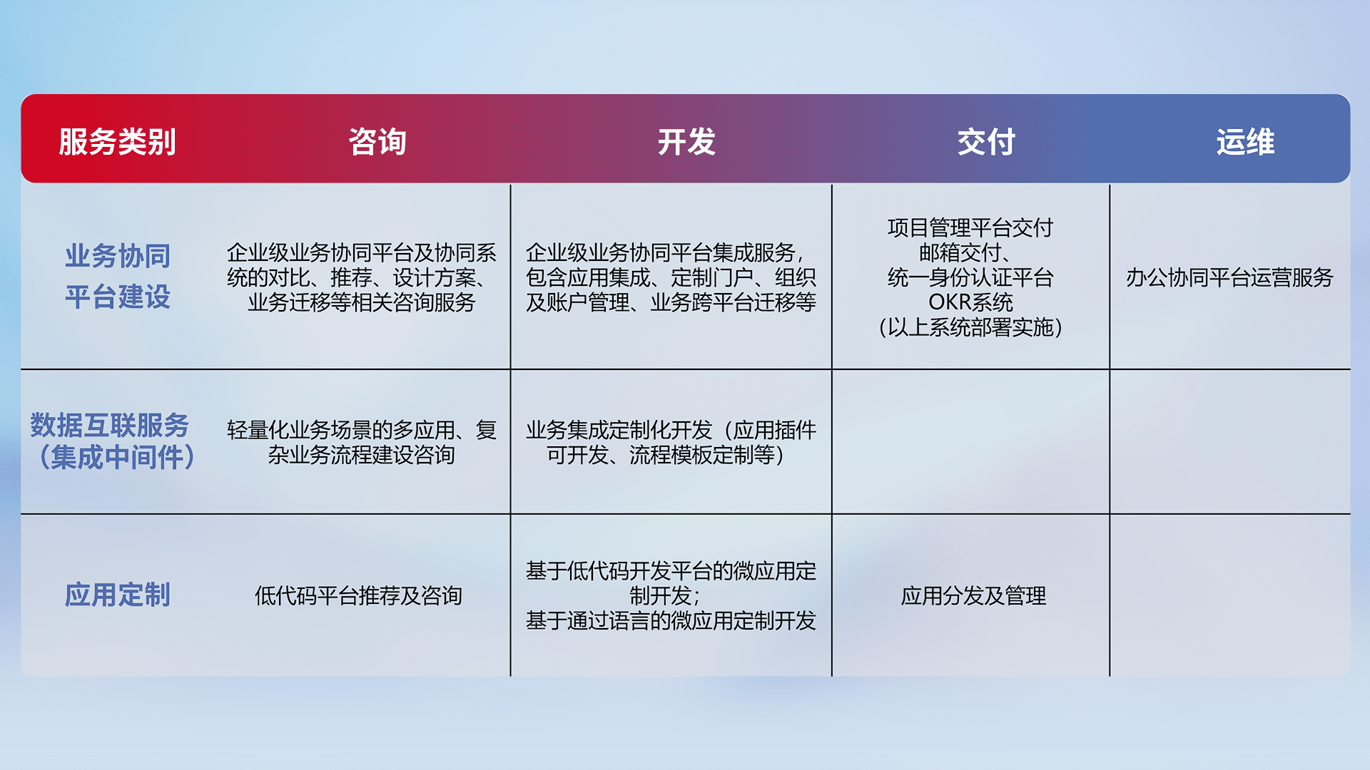 针对钉钉、、企微、、IDaas等平台级产品提供产品的规划、、、方案、、交付、、定制化开发等服务,,,实现如统一协同办公、、、智能客户服务、、、、混合会议管理、、、、智能数据查询、、、等业务场景,,,实现数字化转型。。